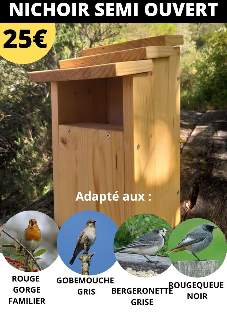 Nichoir Semi Ouvert : Rouge gorge / Bergeronette Grise / Rouge Queue noir / Gobe mouche Gris