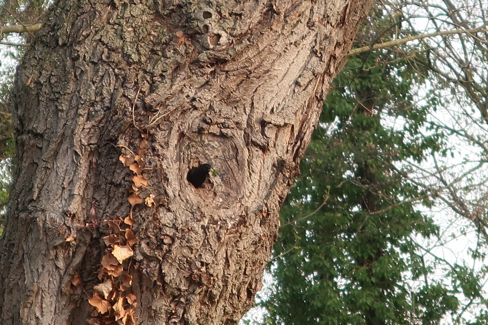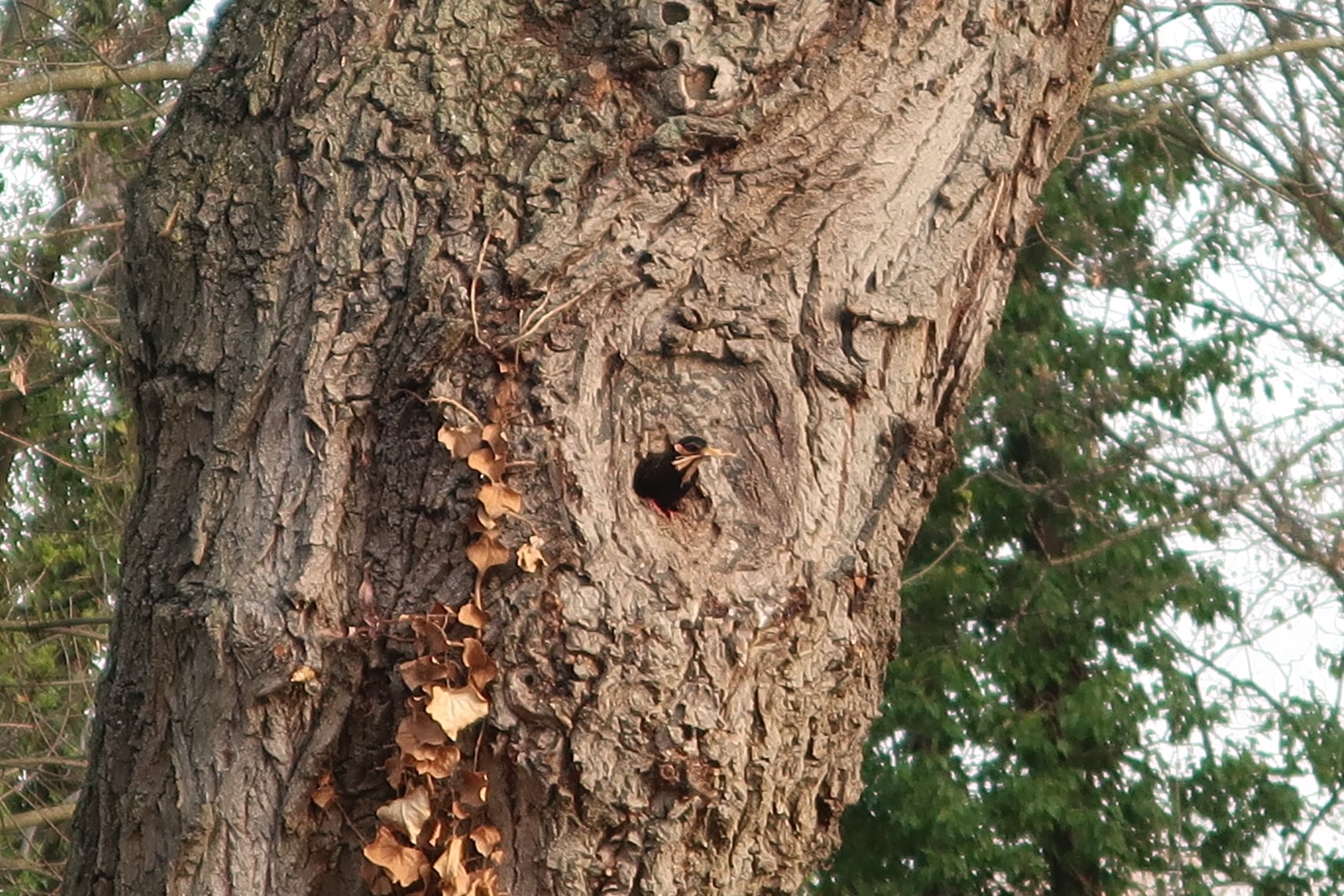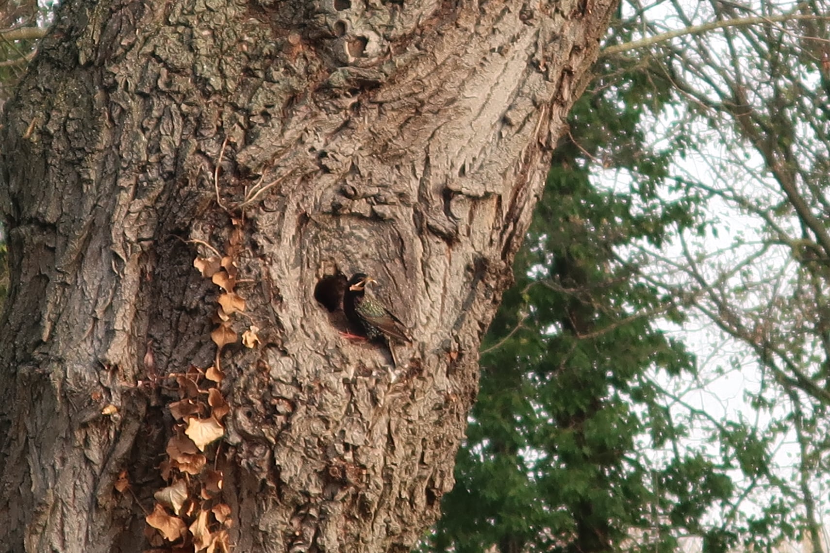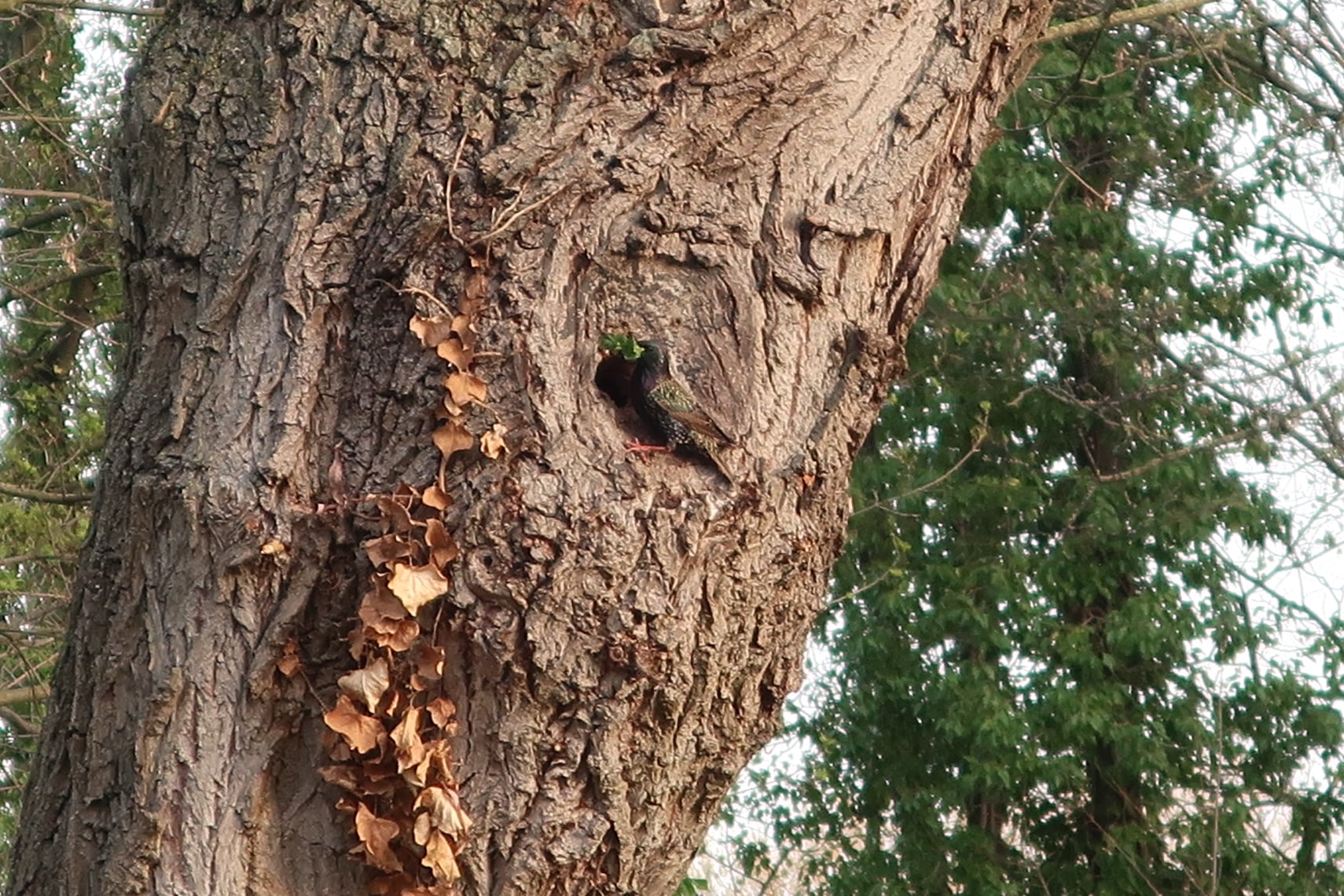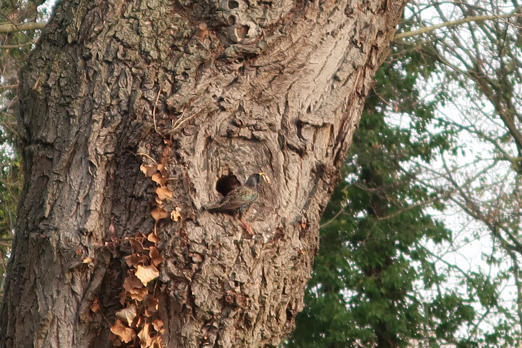 L’étourneau est cavernicole (il utilise des cavités pour nicher), et les lieux propices se font de plus en plus rare avec la raréfaction de vieux arbres, d’arbres morts, la rénovation des bâtis.La concurrence est donc réelle avec les pics, les sittelles, les mésanges, et d’autres oiseaux selon les régions qui recherchent les même cavité pour y faire leurs nids. Heureusement, ce mâle à trouver cet ancien trou de Pic Vert.