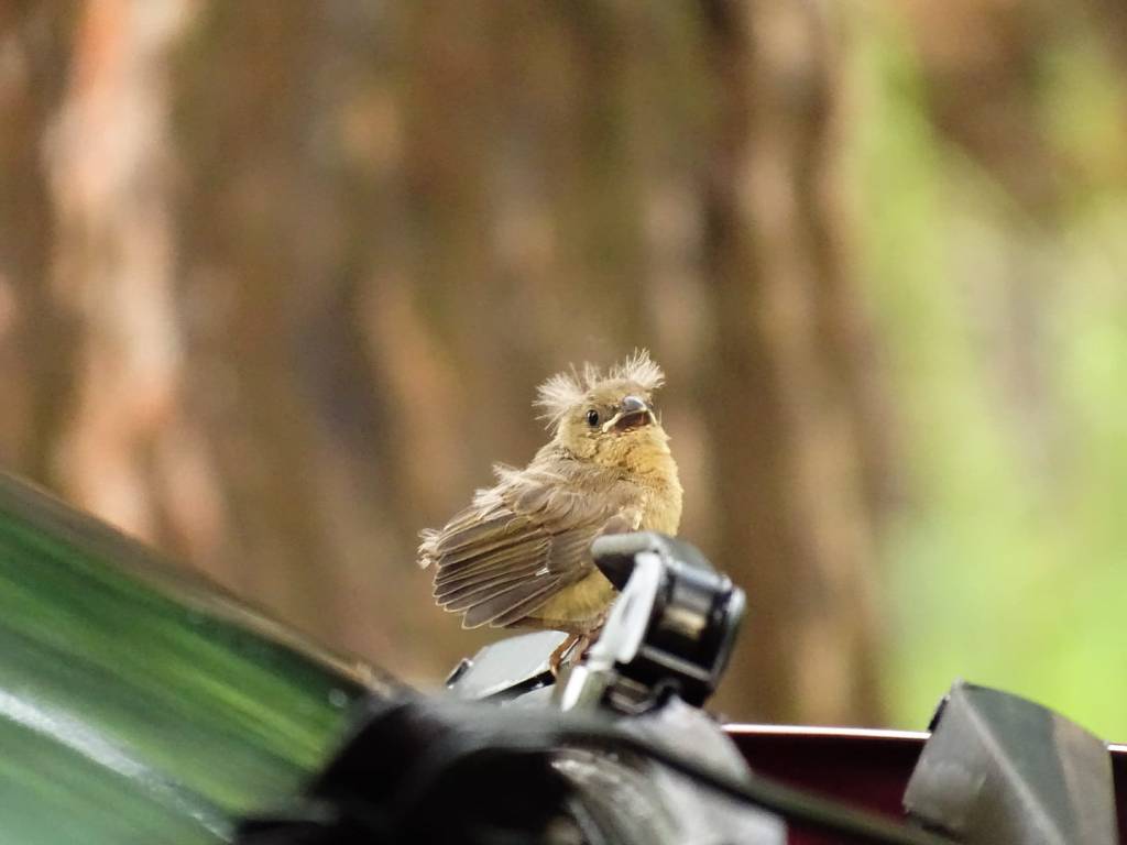 Après avoir fait des premiers bonds dans le buisson attenant au nid, c’est sur la voiture qu’il continue son exploration, tout en criant famine à sa mère qui continue à venir le nourrir, partout où il se déplace.