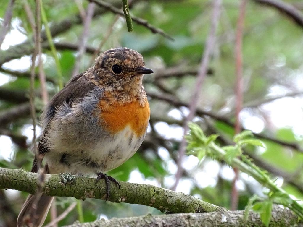 Ici ce Rouge-gorge est né cette année, à en noter la coloration tachetée de son plumage. Sa mue « post-juvénile » commence a lui offrir sa couleur orangée de la poitrine.
