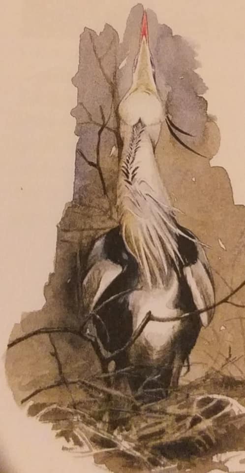 « Avant d’atterrir au nid il émet un appel rauque pour se faire connaître de son partenaire. Ce dernier répond en donnant de la voix et en allongeant le cou et le bec vers le ciel, stretch display (photo d’en tête) »