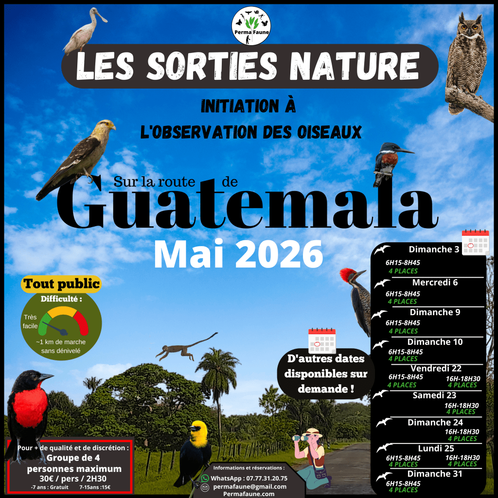 Bien que nous recherchons principalement les oiseaux (rapaces, passereaux, limicoles, martins-pêcheurs, …) on observe régulièrement des singes, des paresseux, parfois des serpents, couendou et d’autres animaux étonnants ! À chaque sortie son lot de rencontres et de surprises !